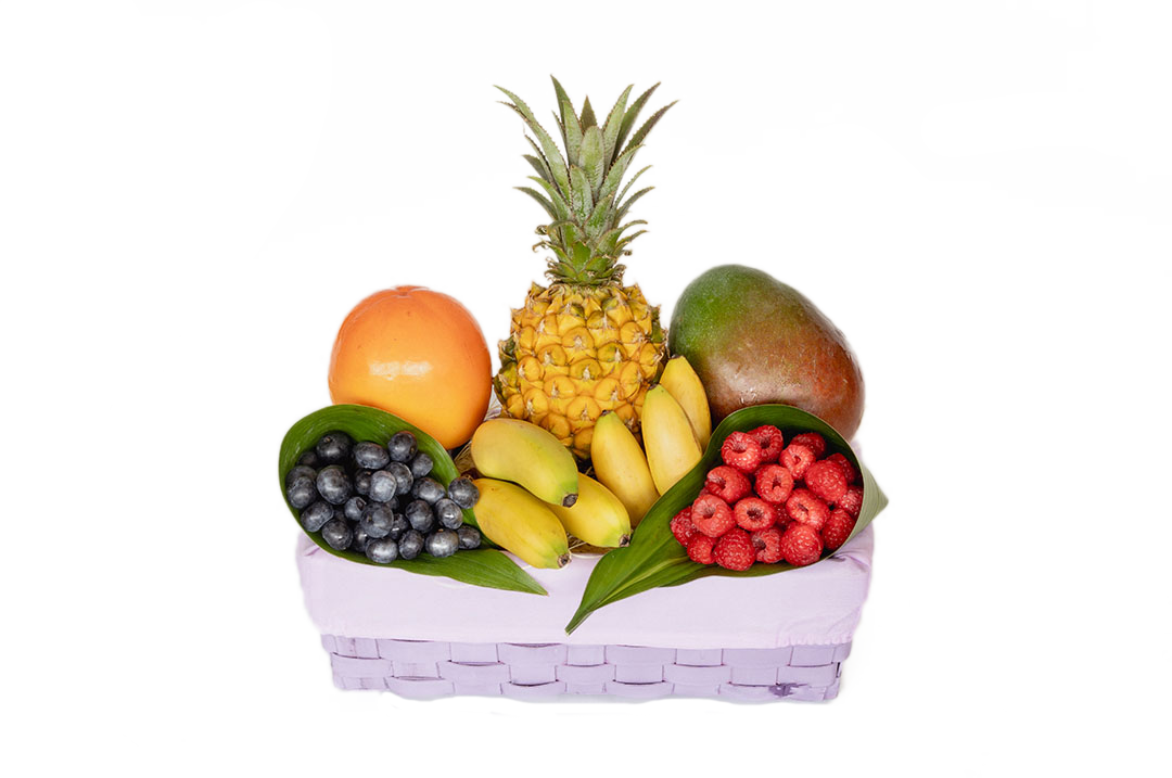 Cesta de frutas compuesta por arándanos, cerezas, chirimoya, coco, frambuesas, granada, kiwi, mandarinas, mango, manzanas Rojas, manzanas Royal Gala, melón Verde, moras, naranjas, peras Conferencia, piña, plátanos, Uva Blanca y Uvas Red Globe.