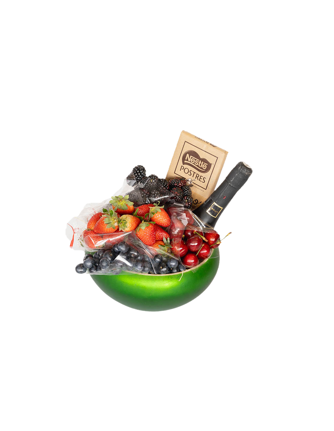 Cesta de frutas compuesta por arándanos, cerezas, fresas, moras, mini botella de champagne y tableta de chocolate.